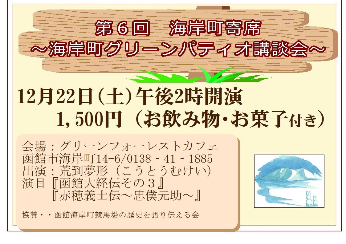 第6回 海岸町寄席~海岸町グリーンパティオ講談会~ Saturday, December 22, 2018 2:00 PM 3:00 PM 14:00 15:00 Google Calendar ICS