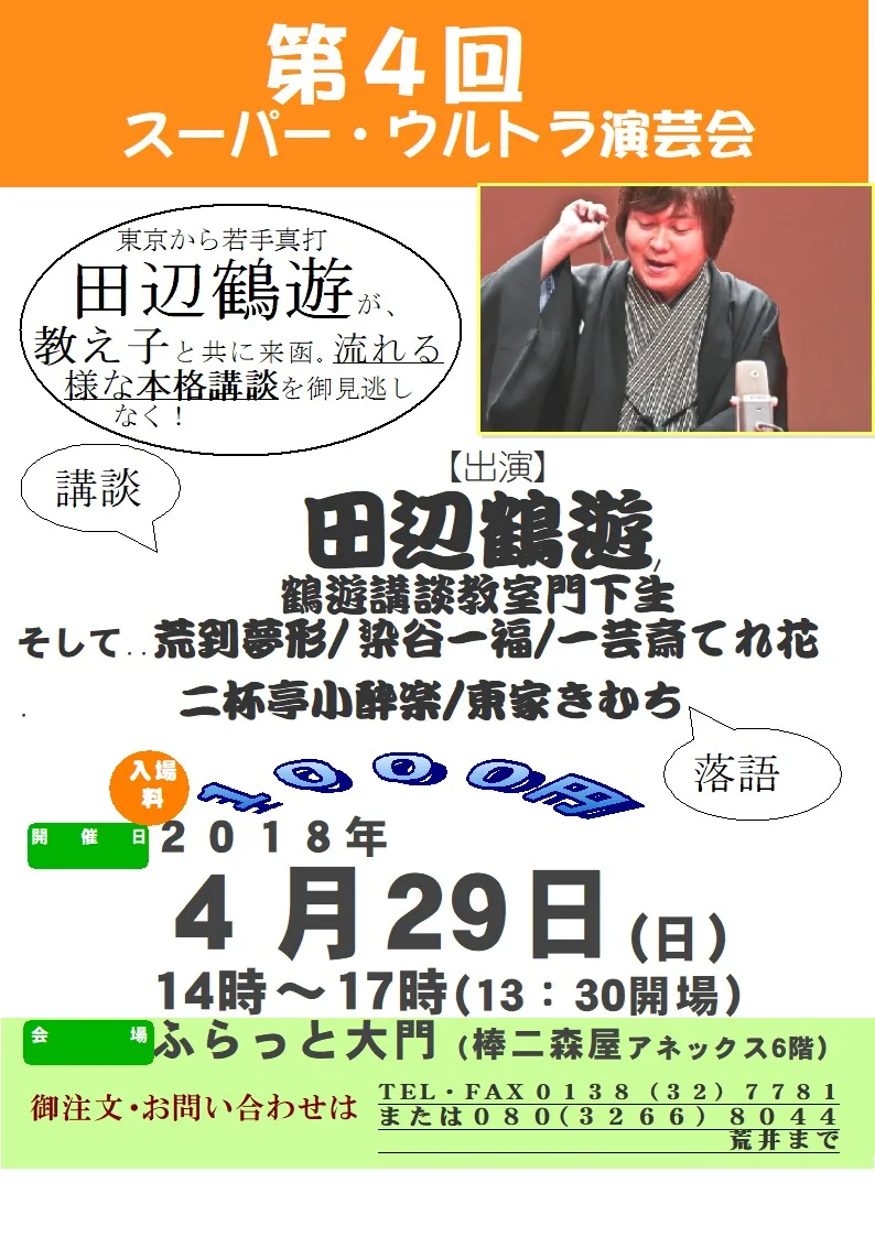 第4回スーパー・ウルトラ演芸会(1000円と、破格のお値段で超一流の講談を!) Sunday, April 29, 2018 2:00 PM 7:00 PM 14:00 19:00 Google Calendar ICS