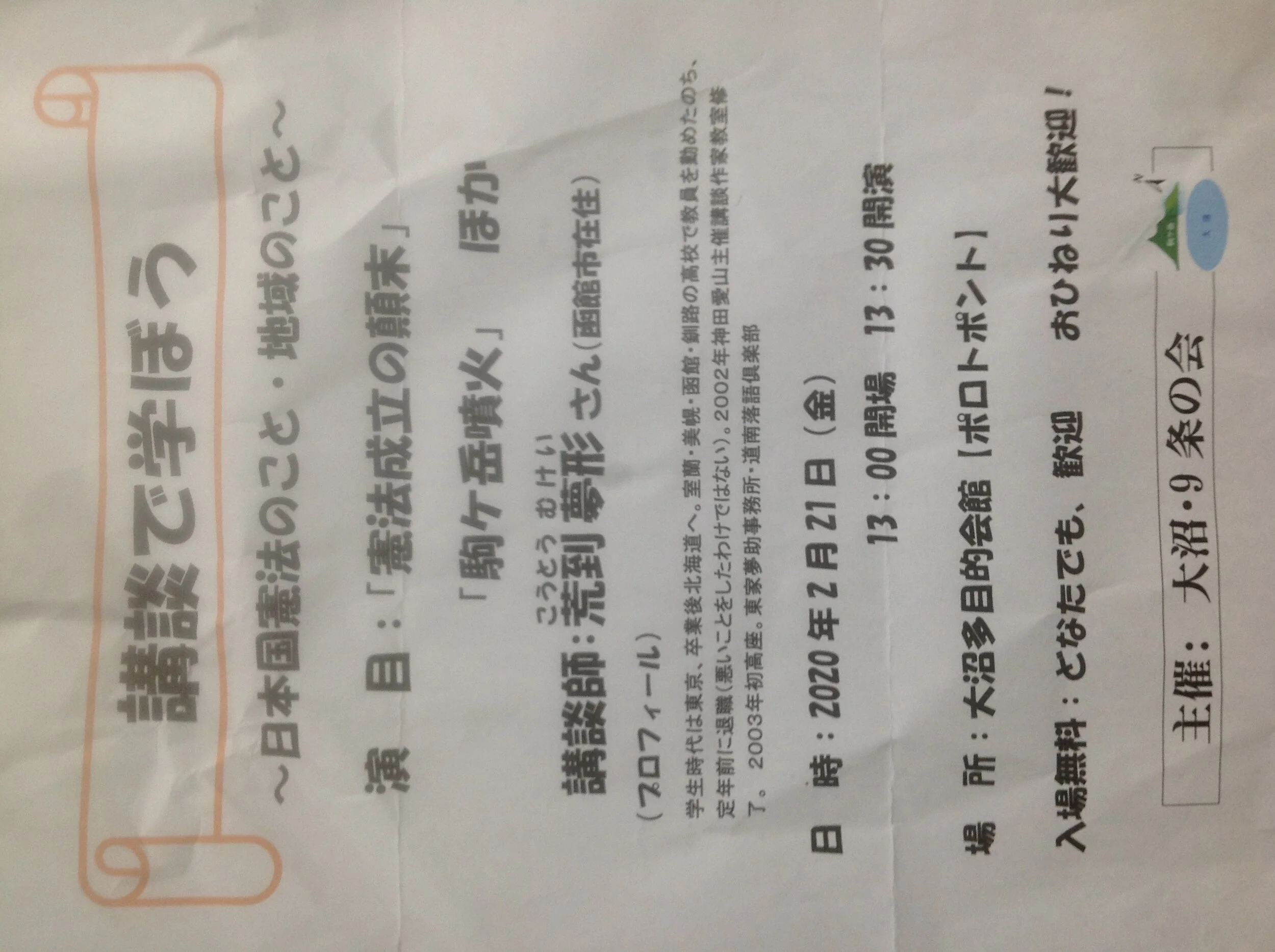 講談で学ぼう 憲法の事・地域の事 Friday, February 21, 2020 1:30 PM 3:00 PM 13:30 15:00 Google Calendar ICS 講談で学ぼう憲法の事・地域の事 日時:2月21日(金)午後1時半〜3時 会場:北海道七飯町大沼多目的会館 料金:無料(カンパ歓迎) 出演:荒到夢形 連絡先:家村090-3113-7806