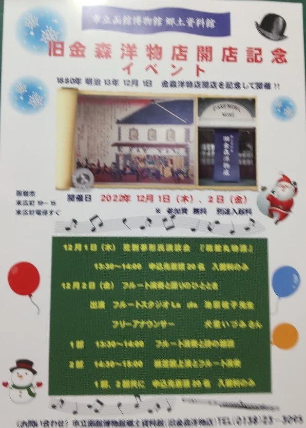 旧金森洋物店開店イベント (Copy) Thursday, December 1, 2022 1:30 PM 2:00 PM 13:30 14:00 Google Calendar ICS 会場:函館市郷土資料館料金:無料(要別途入館料)出演:荒到夢形『箱館丸物語』連絡先:郷土資料館 0138-23-3095
