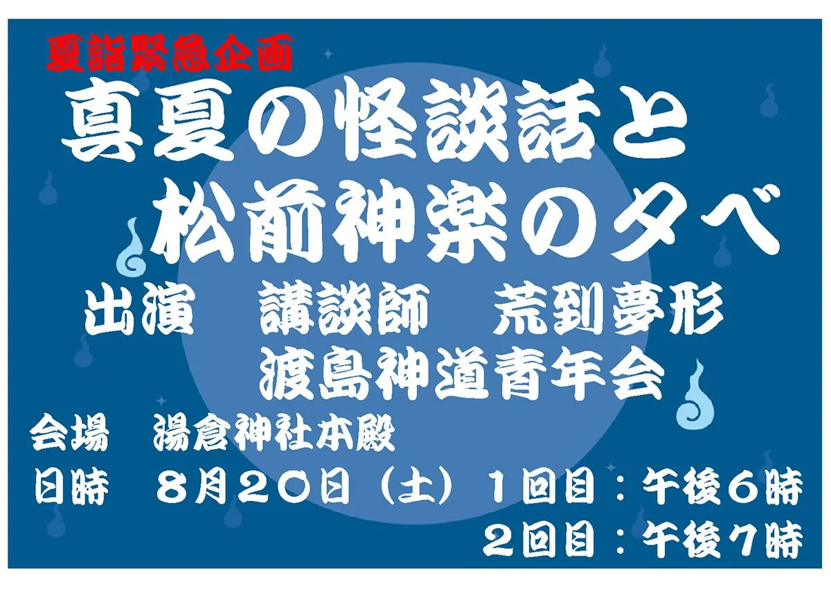 真夏の怪談話と松前神楽の夕べ Saturday, August 20, 2022 6:00 PM 8:00 PM 18:00 20:00 Google Calendar ICS 入場無料お問い合わせ先:湯倉神社 0138-57-8282
